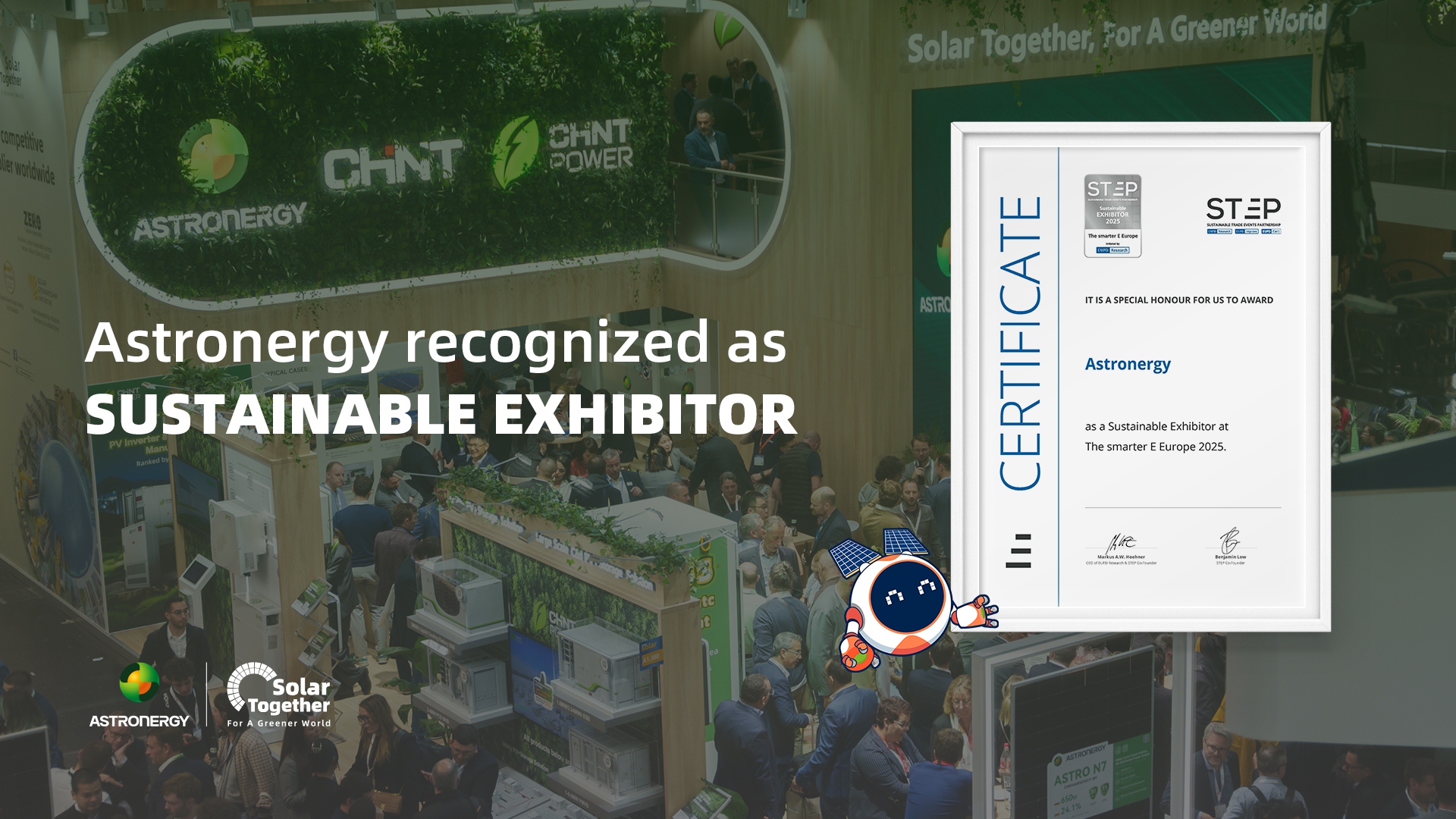 Astronergy ist stolz darauf, bekannt geben zu dürfen, dass das Unternehmen für seinen Messestand auf der Intersolar Europe 2025 mit dem Sustainability Award der STEP – Sustainable Trade Events Partnership ausgezeichnet wurde. Diese Auszeichnung unterstreicht das Engagement von Astronergy für umweltbewusstes Design und sein kontinuierliches Bestreben, die Net-Zero-Ziele zu erreichen.